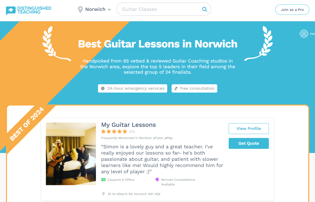 Our guitar division ‘My Guitar Lessons‘ have won yet another award for the Best Guitar Lessons in Norwich, where we have 3 approved guitar teachers giving lessons. Please click HERE to see a list of them.