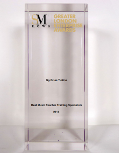 We have won yet another award for our excellent training packages for music teachers in the UK. The award was given from ‘Greater London Enterprise Awards‘ to our drummer division – ‘My Drum Lessons‘ and marks winning this three years running. We were delighted to receive our trophy from the G.L.E.A today and have a picture below to show you what it looks like. If you would like to be involved with our award winning drum teaching business please go to www.BecomeAMusicTeacher.com to sign up.